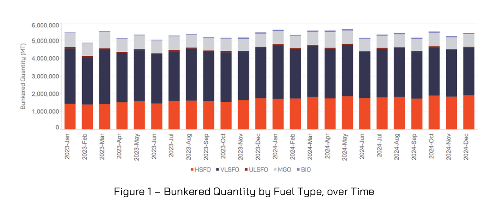 Across 2024, the fuel mix with respect to samples received for testing in VPS laboratories, equated to more than 65 million MT, which averages at 5.4 million MT of marine fuels per month. VLSFO was the most popular marine fuel with 52% of the fuels used, followed by 32% HSFO, 14% MGO, 1% ULSFO and 1% Biofuels. Regarding biofuels usage, the samples tested by VPS equated to an increase from 558,000 MT in 2023 to 800,000MT in 2024.