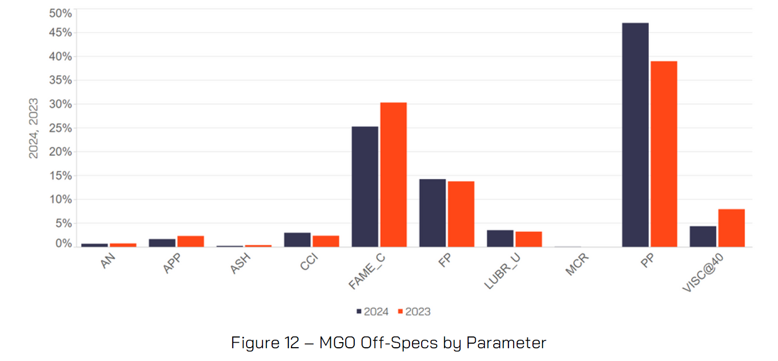 Pour Point was also a common off-specification parameter for VLSFOs with 13% of VLSFOs off-specs relating to this parameter, a decrease against the 16% level witnessed in 2023.