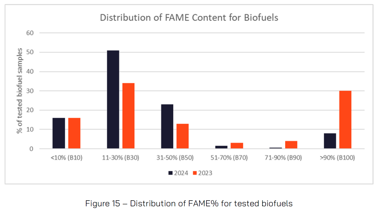 The most common biofuel blend was B30 (11-30% bio), which accounted for 51% of biofuel samples tested by VPS an increase from 34% in 2023. Yet, there was a significant move away from B100 in 2024 compared to 2023, 8% compared to 23% respectively. This may be due to fuel cost and/or availability.
