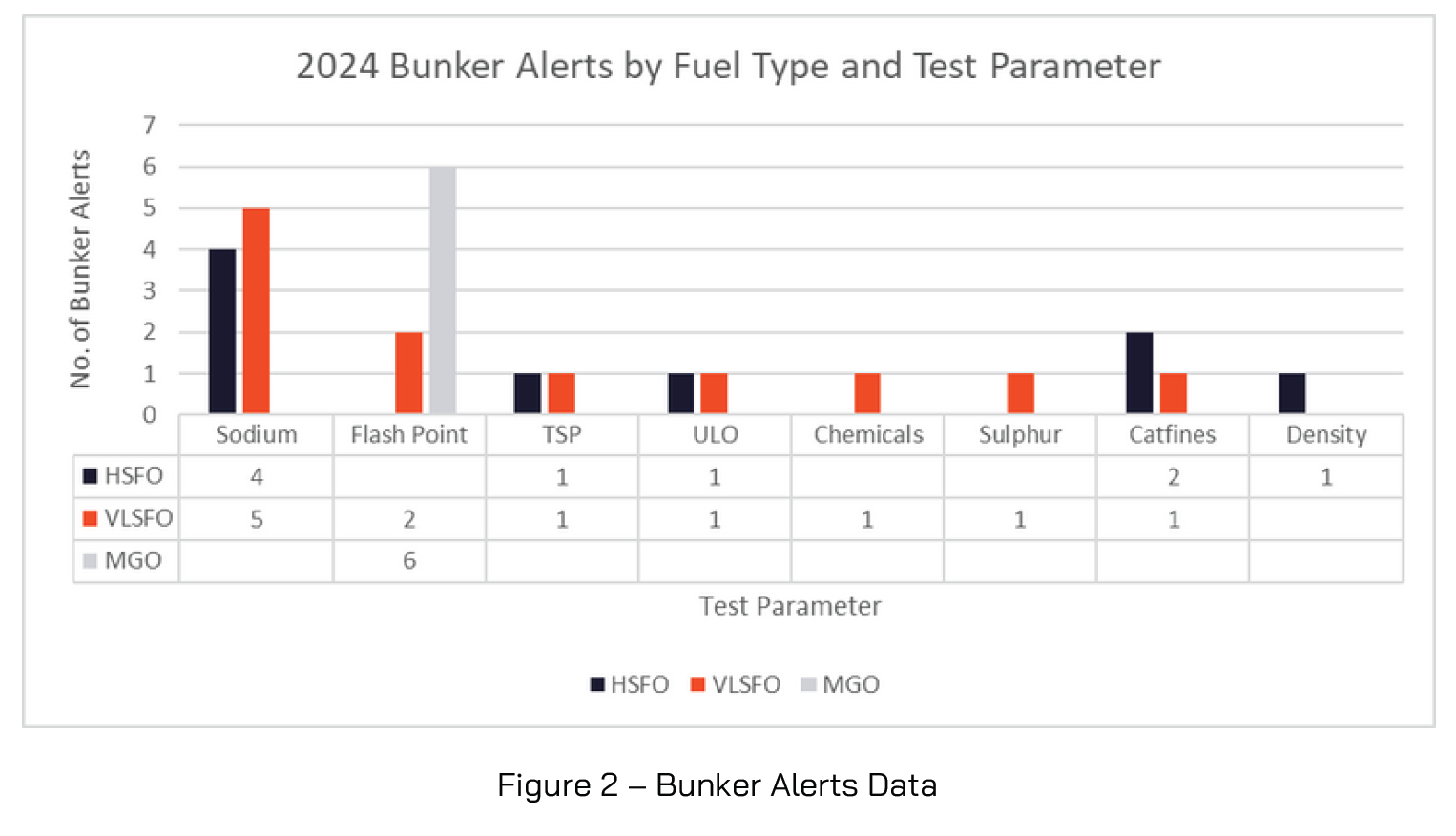 46% of the 2024 Bunker Alerts were for VLSFO fuels, followed by 32% for HSFO fuels and 21% for MGO. The most common problematic parameter was Sodium (9), accounting for 33% of the Bunker Alerts, followed by Flash Point (8) accounting for 30% of the Bunker Alerts.