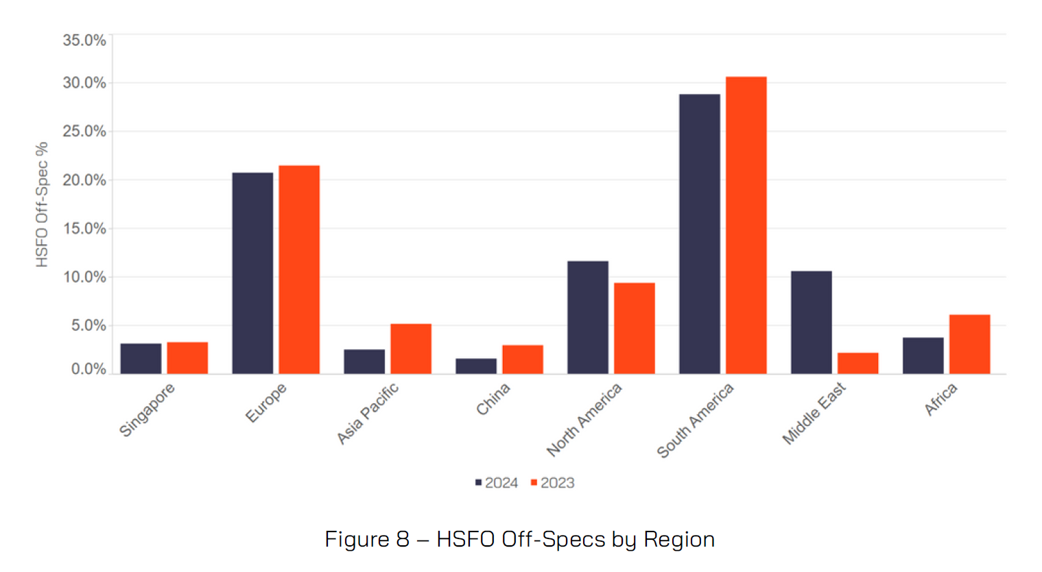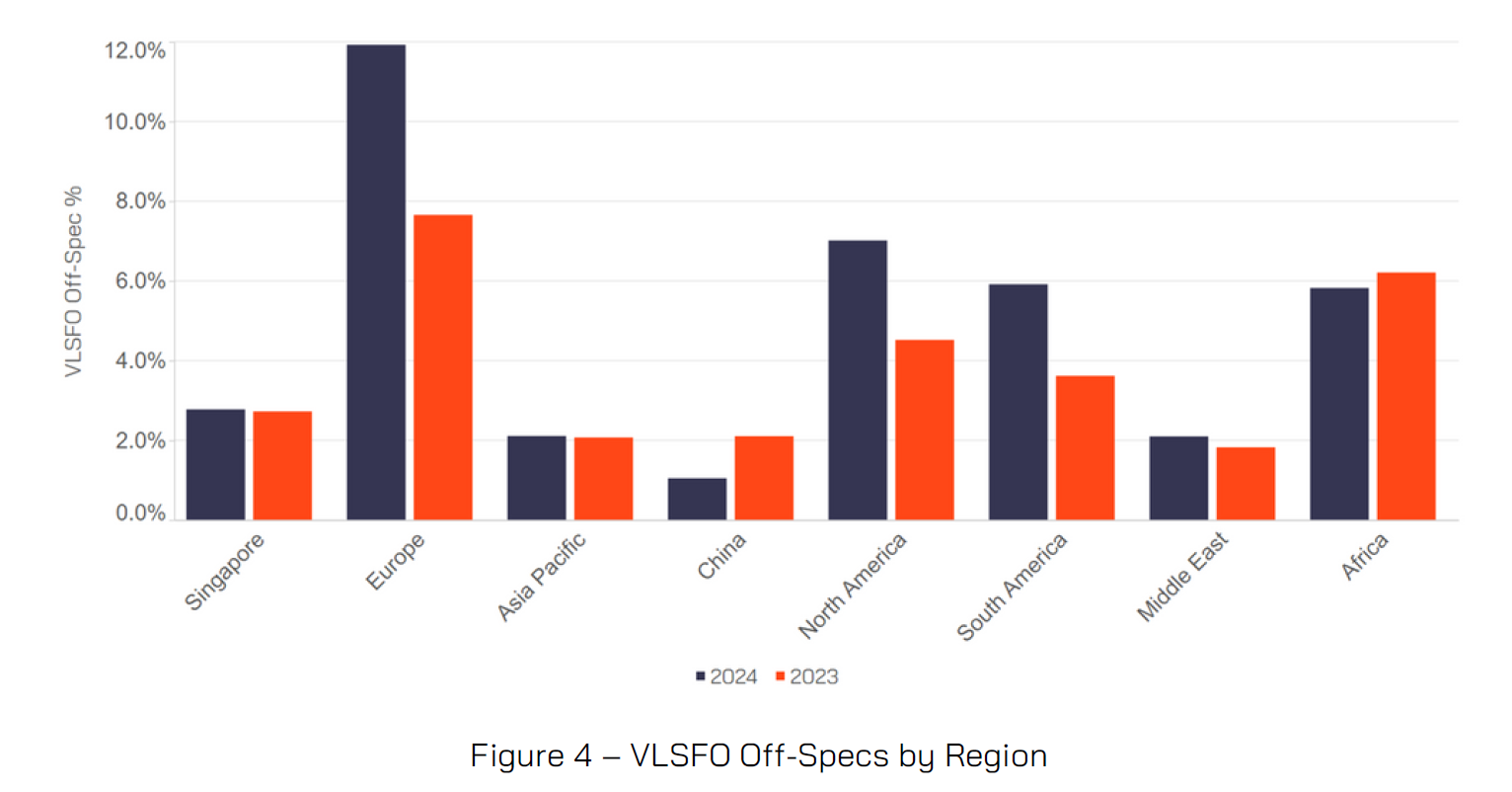 As the most used marine fuel type, VLSFO accounts for more than half of the fuels tested by VPS. In terms of quality, VLSFO had an off-specification rate of 5.4% in 2024. Of the 5.4% VLSFO off-specifications, Europe provided the highest level of off-specification VLSFOs in both 2024 (11.9%) and 2023 (7.9%). North America provided the next highest level of off-specification VLSFO with 7% of fuels tested exhibiting at least one off-specification parameter in 2024 and 4.4% in 2023. South America had the third highest VLSFO off-specification rate with 5.9% off-specs versus 3.8% in 2023.