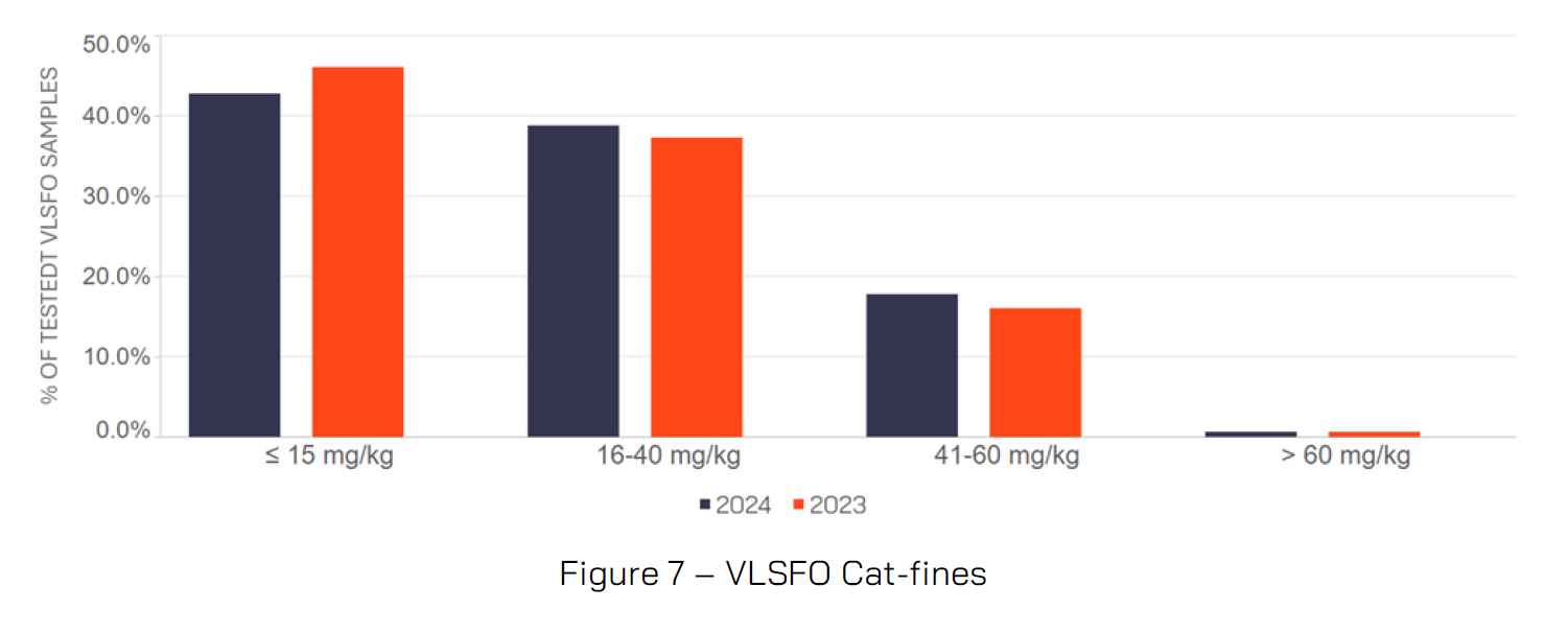 2024 saw a very similar distribution of cat-fines results across all VLSFOs tested compared to 2023, with only 0.6% of samples showing cat-fine levels of greater than 60ppm and hence off-specification. 19% of all VLSFOs showed a cat-fine level greater than 40ppm. Frequent checking of purifier efficiency via VPS’ Fuel System Checks (FSC) service is a highly recommended proactive safeguard in respect to increased cat-fines within VLSFOs.