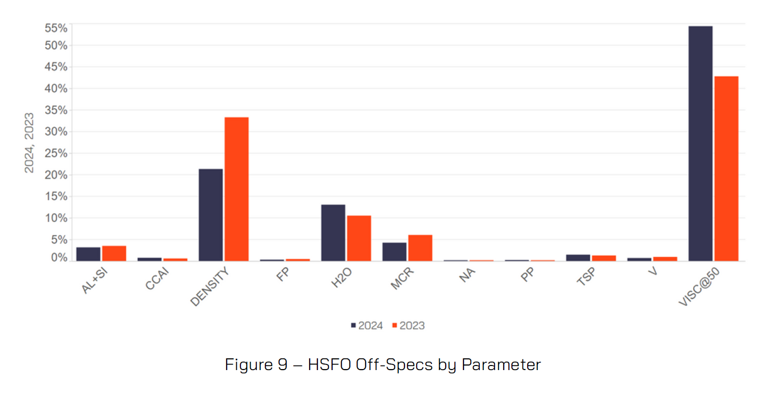 As usual, viscosity and density were the two most common HSFO off-spec parameters in 2024, with 54% of the off-spec attributed to viscosity and 21% to density, compared to 43% and 33% respectively in 2023. Water was the third most frequent HSFO off-specification parameter in 2024, with 13% off-spec level compared to 10.5% in 2023.