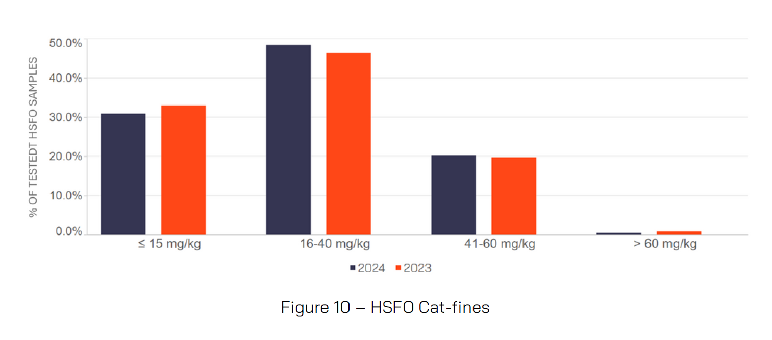 Whilst cat-fines accounted for 3% of HSFO off-specs in 2024, this was lower than the 2023 level of 4%. Again, like VLSFOs it highlights the importance of Fuel System Checks (FSC) to protect the engine from potential damage from this corrosive contaminant, by improving purifier efficiency. 20% of HSFOs had a cat-fine level of >40ppm in 2024.