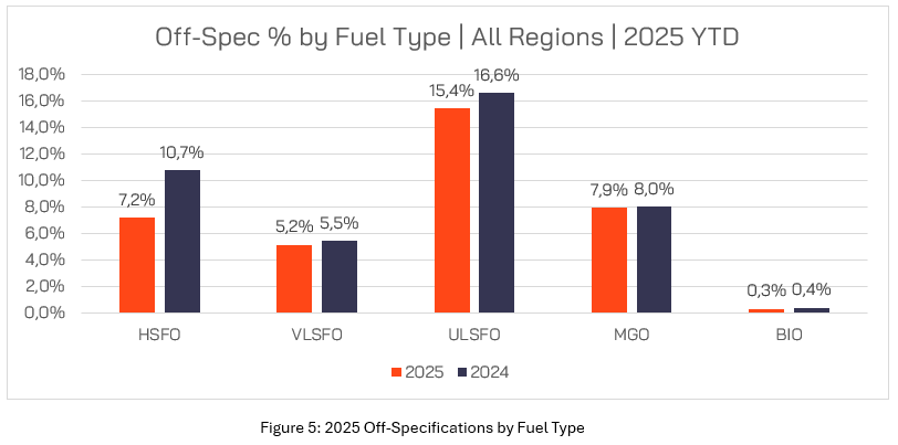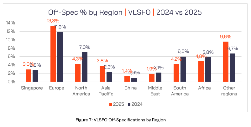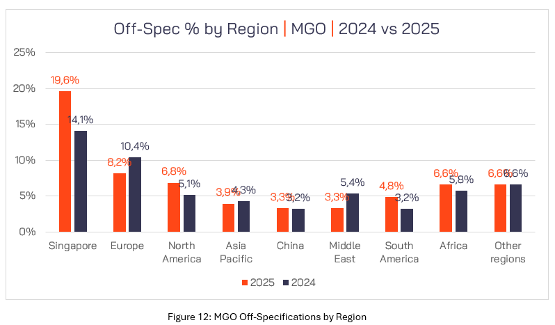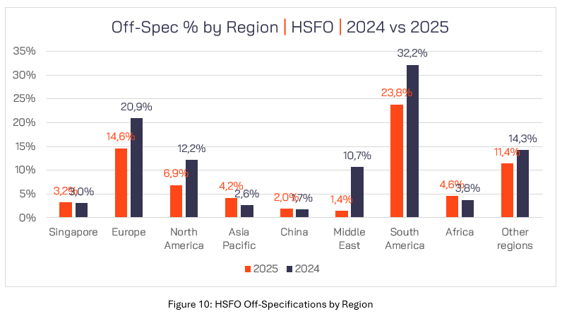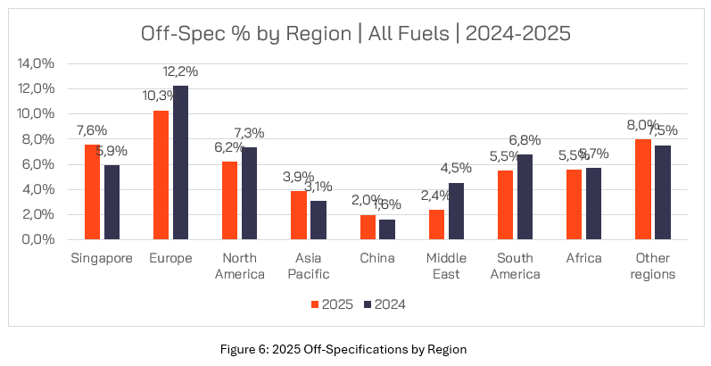 In terms of region, Europe continues to be the area providing the highest level of off-specification fuel, even though the level of off-specs improved in 2025 versus 2024, going from 12.2% to 10.3%. However, Singapore’s off-specification rate increased from 5.9% in 2024 to 7.6% in 2025.