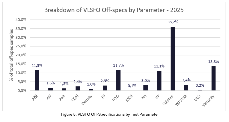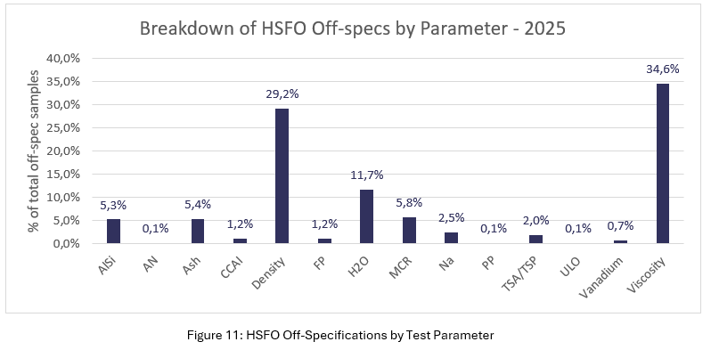 As usual, viscosity and density were the two most common HSFO off-spec parameters in 2025, with 35% of the off-spec attributed to viscosity and 29% to density, compared to 54% and 21% respectively in 2024. Water was the third most frequent HSFO off-specification parameter in 2025, with 12% off-spec level compared to 13% in 2024.