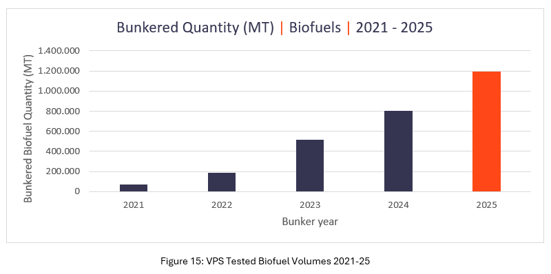 As global shipping looks towards low-to-zero carbon fuels to answer many emissions reduction challenges, biofuels offer an immediate “drop-in” solution. As such VPS tested the equivalent of approximately 1.2 million mt of biofuels in 2025 compared to 800,000 mt in 2024.