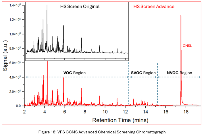 To counter this, VPS developed a new, unique, pre-burn chemical screening method, which allows the detection of volatile, semi-volatile and non-volatile organic compounds in one single 20-minute analysis time. This new screening method can be used in place of the original VPS screening method, which detected only volatile organic compounds.