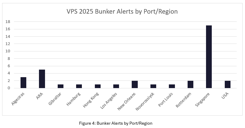 Singapore accounted for 46% of the Bunker Alerts issued in 2025, which is an unusually high level. Whilst China did not require any Bunker Alerts during the course of the year.