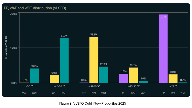 The importance of the additional cold-flow test of Wax Appearance Temperature (WAT) and Wax Disappearance Temperature (WDT), was further highlighted in 2025 with 59% of VLSFOs exhibiting WAT of 31-40ºC and 10% having WAT between 41-50ºC. 57% of VLSFO samples had a WDT of 41-50ºC, with 19% having a WDT of >50ºC. VLSFOs cold-flow properties are a definite concern with wax precipitating from the fuel at temperatures way in excess of 10ºC above the pour point, potentially causing numerous operational problems such as filter and pipework blockages.