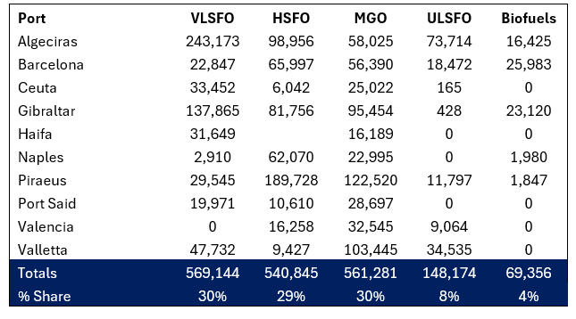 The Mediterranean ECA came into force on 1st May 2025. For the six months leading up to the implementation of the Mediterranean ECA and the six months after, the following ports provided 90% of all fuel within the region (fuel volumes in mt):
