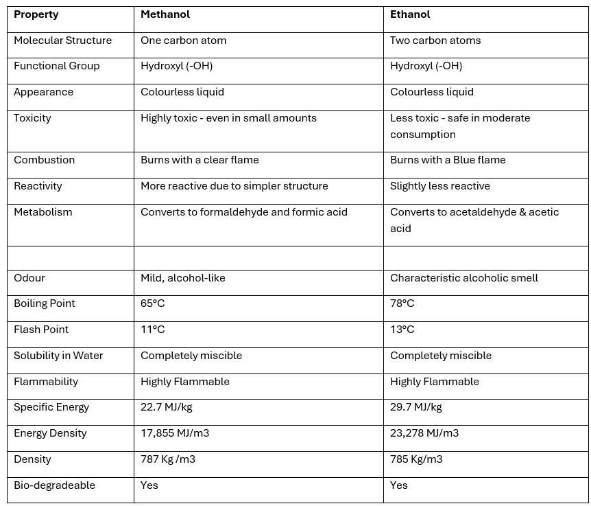 Methanol and Ethanol exhibit very similar chemical and physical characteristics and both have numerous fuel management pro’s and con’s when being considered as a marine fuel. The properties of both methanol ad ethanol are listed below for comparison: