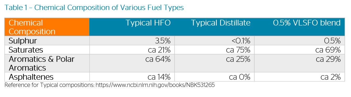 Compliance with the 2020 IMO 0.5% sulphur cap has driven the introduction of new 0.5% VLSFO’s produced by blending low sulphur distillates with conventional Heavy Fuel Oil (HFO). The chemical composition of these new VLSFO blended fuels is variable but strikingly different to HFO, as shown in the table of typical compositions shown below.