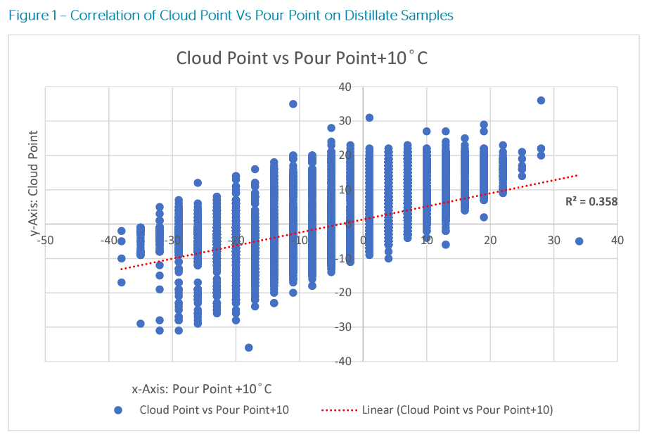 A fundamental problem with the measurement of pour point to assess the risk of fuel waxing is that once the pour point is reached, the fuel has stopped flowing and started to solidify already creating problems. For this reason, the recommendation by CIMAC is to keep the fuel at 10˚ C above the pour point. However, since the definitive cold-flow property measure is cloud point (the temperature at which wax crystals form) it is useful to understand the correlations between pour point and cloud point.