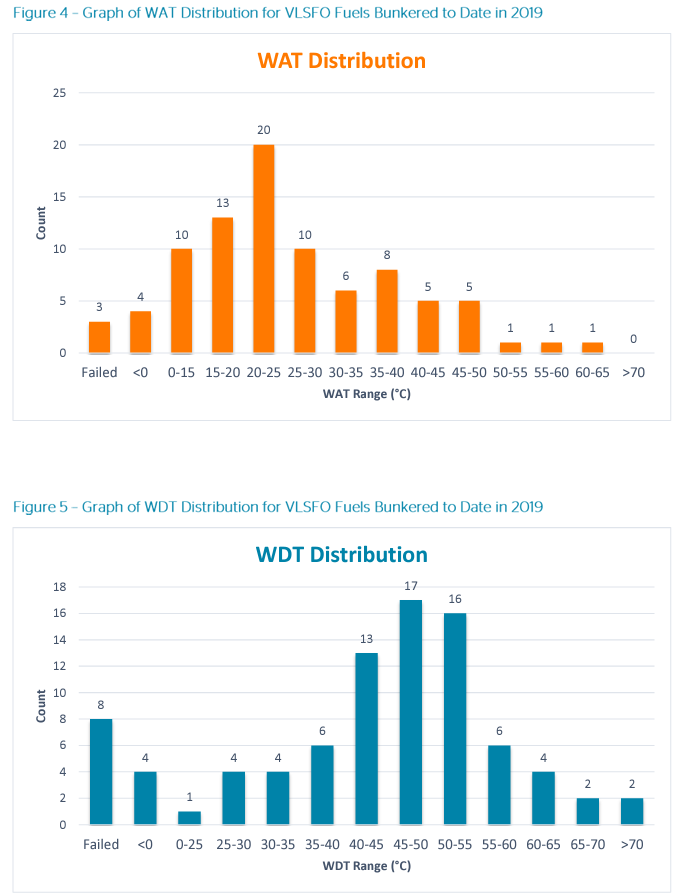 The increased paraffinic content (saturates) arising from the distillate composition of the new blended 0.5% VLSFO increases the likelihood of wax precipitation compared to HFO fuels. The temperature at which wax precipitation starts is dependent upon the chemical composition which varies significantly from fuel to fuel. Measurement of the temperature at which wax precipitation starts (the WAT, which is the temperature at which wax crystals appear) is important to determine the cold-flow risk of VLSFO fuels.