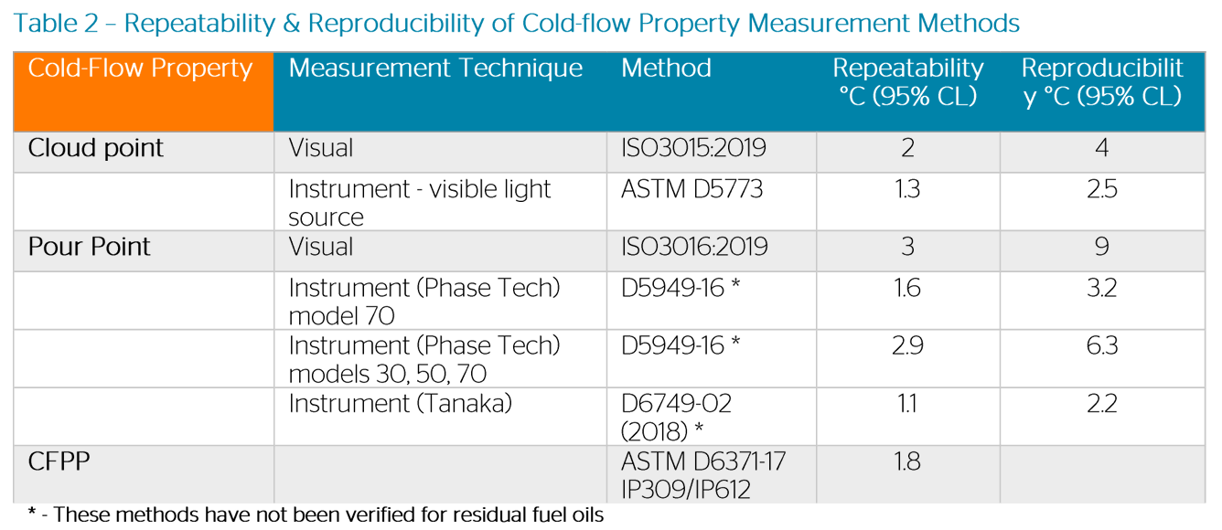 Cloud point is the definitive cold-flow property measure, since this indicates the temperature at which wax crystals start to form. The fuel will continue to flow at temperatures above the cloud point. Current test methods do not enable cloud point to be measured for opaque fuels as stated below: