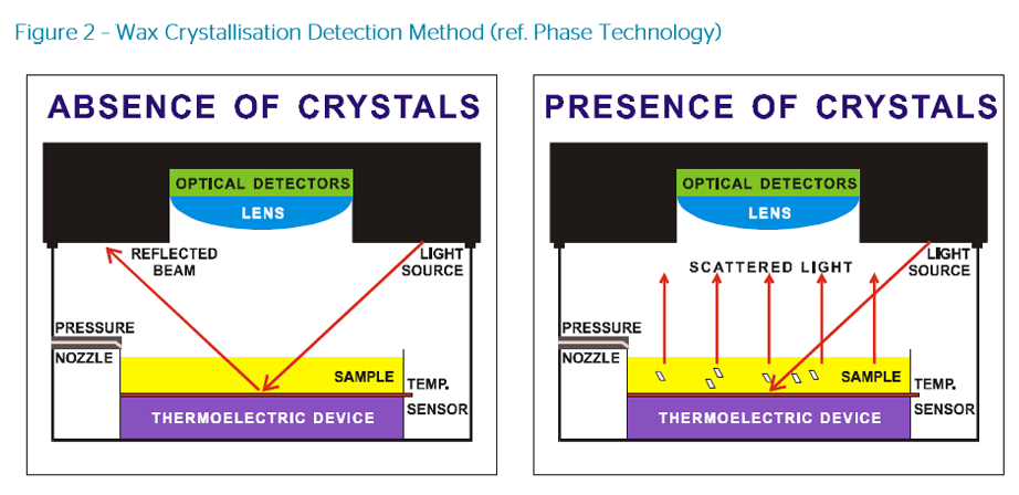The operating principle of the instrument is an optical light scattering technique which detects phase changes of crude oil with high levels of sensitivity and accuracy. The presence of wax crystals is detected in the fuel by measuring the scattering of a light source as in the diagram below. Since it is an instrumental technique the measurement is not subjective. The phase change detected is the temperature at which a crude oil sample first precipitates solid wax as it is being cooled, which is termed WAT. Similarly, the Wax Disappearance Temper (WDT) is the temperature at which the last wax solids are melted into liquid when the oil is warmed.