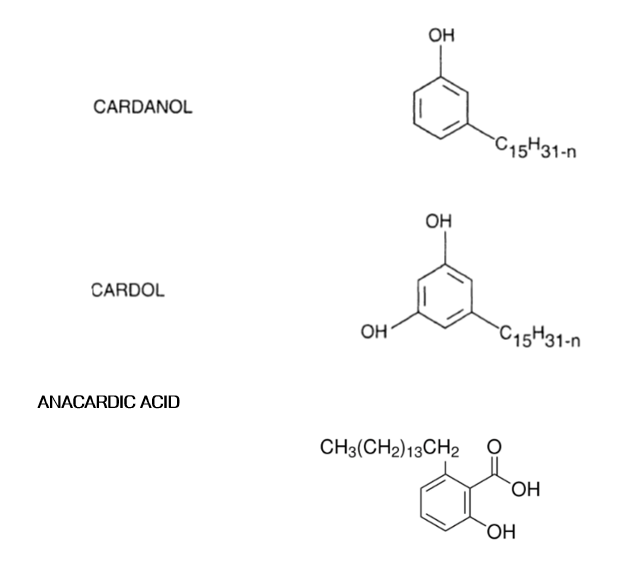 There are three main components of CNSL, these are Cardanol, (also known as Ginkgol), Cardol and Anacardic Acid: