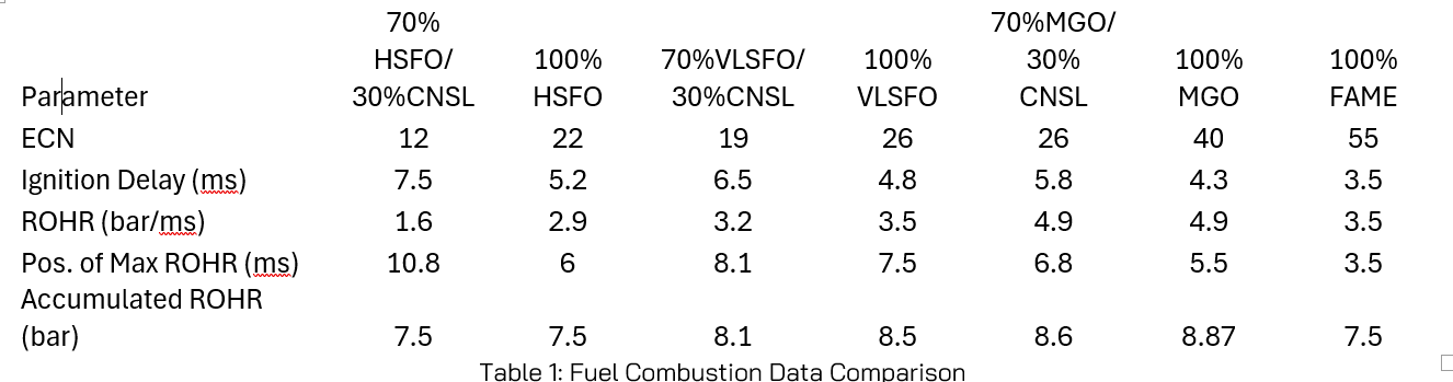 In the recent past, VPS have tested CNSL products, blended with marine gas oil (MGO), very low sulphur fuel oils (VLSFO) and high sulphur fuel oils (HSFO). When undertaking fuel combustion analysis (FCA) of CNSL blended at varying percentages with MGO, VLSFO and HSFO, a wide range of results were produced in relation to, estimated cetane number, ignition delay and rate of heat release (ROHR), examples are given in the table below: