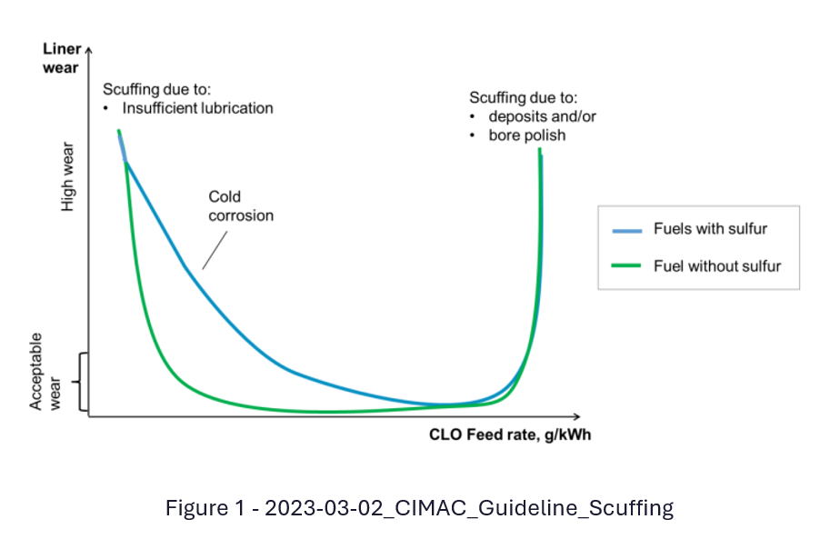 However, additional cylinder oil within the system, not only represents a hidden cost to enhance reliability, but can also lead to significant reliability related issues which occur and manifest over time. Additional lubricant additives that are designed to react with Sulphuric Acid within the engine, can form hard deposits on piston rings, and in extreme cases polish the cylinder liner surface. This leads to scuffing, or engine seizing, due to future lubricant injections being unable to maintain the film thickness and distribution required within the engine. The key indicator of potential over-lubrication in this instance, is the lack of depletion of Base Number when compared to the fresh Base Number of the cylinder oil in use. Note, OEM’s recommend a safe level to be in excess of 10-15mg/KOH for the majority of cylinder oil and fuel combinations in use, with both Everllence and WinGD recognising the dangers that over-lubrication can bring.