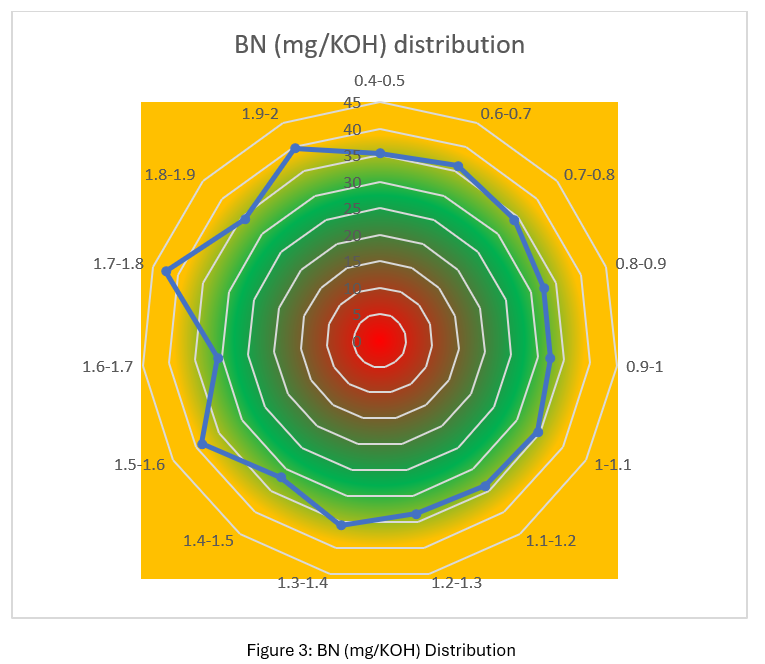 As previously mentioned, elevated and consistent results reporting low total Iron (Fe) content as an indication of mechanical and corrosive wear, coupled with BN results in excess of 20mg/KOH, provide a platform for vessels to iteratively reduce feed rates based upon ongoing onboard quick monitoring, and detailed lab analysis. Scenarios will continue to exist where feed rates should be temporarily elevated, such as the running-in of engine components, or cylinder liners. However, these should be on a temporary basis, following OEM guidelines and reverting once wear metals are within limits. A review of VPS’ database shows substantial optimisation potential to reduce the global fleet’s BN and subsequent cylinder oil consumption, with BN levels across the fleet falling on the higher side.