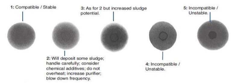 Compatibility problems must be treated as a critical concern, as they can lead to fuel starvation in diesel generators, potentially resulting in power loss. Incompatibility may cause fuel system paralysis  and the subsequent clean-up is often both complex and time-consuming. There is a very simple, indicative test which can be carried out to highlight a fuels compatibility, the ASTM D4740 “spot test”. Here a blend composed of representative volumes of the sample fuel and the blend stock is heated and homogenized. A drop of the blend is put on a test paper and heated to 100°C. After 1 hour, the test paper is removed from the oven and the resultant spot is examined for evidence of precipitation and rated for compatibility against D4740 reference spots.