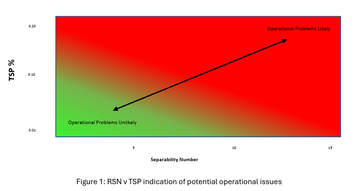 Separability Number, or Reserve Stability Number (RSN): is a complimentary test to the hot filtration stability methods of TSP, TSA, TSE. Using this method, the fuel is mixed with toluene which is aromatic and keeps the asphaltenes in solution. If the sample has poor stability reserve, then asphaltenes will precipitate when Heptane is added- which is naphthenic.  As asphaltenes fall out of solution the transmittance through the sample increases resulting in a measure of the separability number.