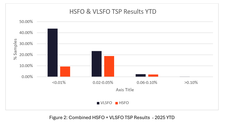 In terms of HSFO stability, 2025 year to date, shows global TSP data is relatively stable, with only 7.1% of all HSFO samples tested exhibiting a TSP of 0.06-0.10% and only 0.1% of samples tested exceeding the specification of 0.10%.