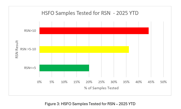 However, VLSFOs tested for RSN this year have shown only 3% of samples with a RSN>10 and only 5% with an RSN of between 5-10.