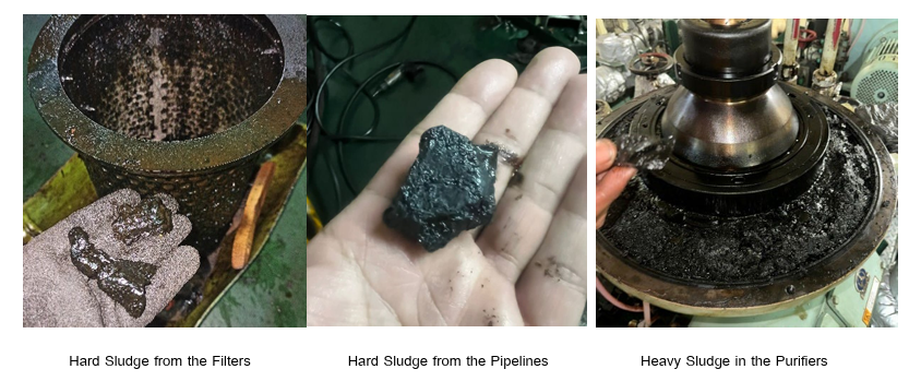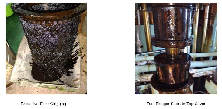 On 3rd May the tank containing the above grade was stripped to allow for the next grade of VLSFO to be used. Within a few hours, whilst the last of contaminated bunkers were being used, all Main Engine plunger barrels seized, the purifiers clogged, and the filters (fine filter / jet filter/ transfer pump filter) were choked. It was noticed that an unusual and excessive plastic-like, hardened sludge, had formed and this inundated the settling / service tanks and sludge tanks.