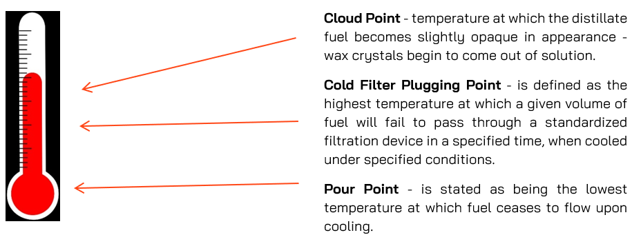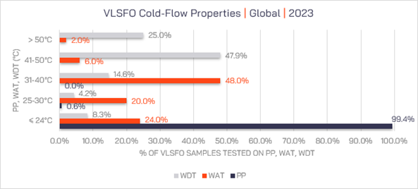 The cold-flow properties of fuels are also important to monitor closely, especially when sailing in colder temperature regions. The Pour Point of HSFOs, VLSFOs and MGO fuels, should always be monitored when colder climates are encountered. Pour Point was the most common MGO off-specification parameter in 2023, with 36.6% of MGO off-specs attributed to Pour Point. However, prior to reaching the pout point of MGO fuel, its cloud point and cold-filter plugging point behaviour offer earlier warning-signs of potential cold-flow issues, relating to wax precipitation from the fuel. It is key fuel management practice to measure these two cold-flow parameters within MGO distillates.