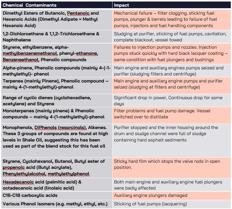 Over time, all of the following chemicals have been found by VPS in marine fuels. The effects of these are highlighted below: