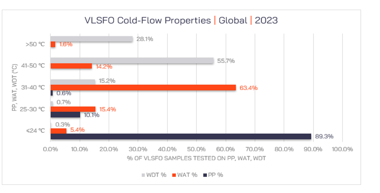 VPS 2023 data shows, at least 15.8% of VLSFO samples had a wax apperance temp (WAT) above 40C, including 1.6% above 50C. These samples will precipitate wax if storage temps are not kept above the WAT, compared to the lower storage temperature requirements based on their tested pour points. Wax formation is a reversible process, so theoritically, it should not cause any operational issue as long as fuel remains stable, but unfortunately, fuel stability is not guanteed. Moreover, if wax is allowed to form, wax and aspheltenes (sludge) can co-mingle together as a result, the wax disappearnce temperature may increase significantly and in the worst case, the wax may no longer disappear. Taking a middle approach and strking a balance could be one option where the fuel is not severly overheated, nor the wax allowed to form freely during storage and only increase temperatures during transfer if needed. VLSFO with such high WAT/WDT will need close attention and care during storage, transfer, treatment and use. Prolonged storage should also be avoided for such fuels.