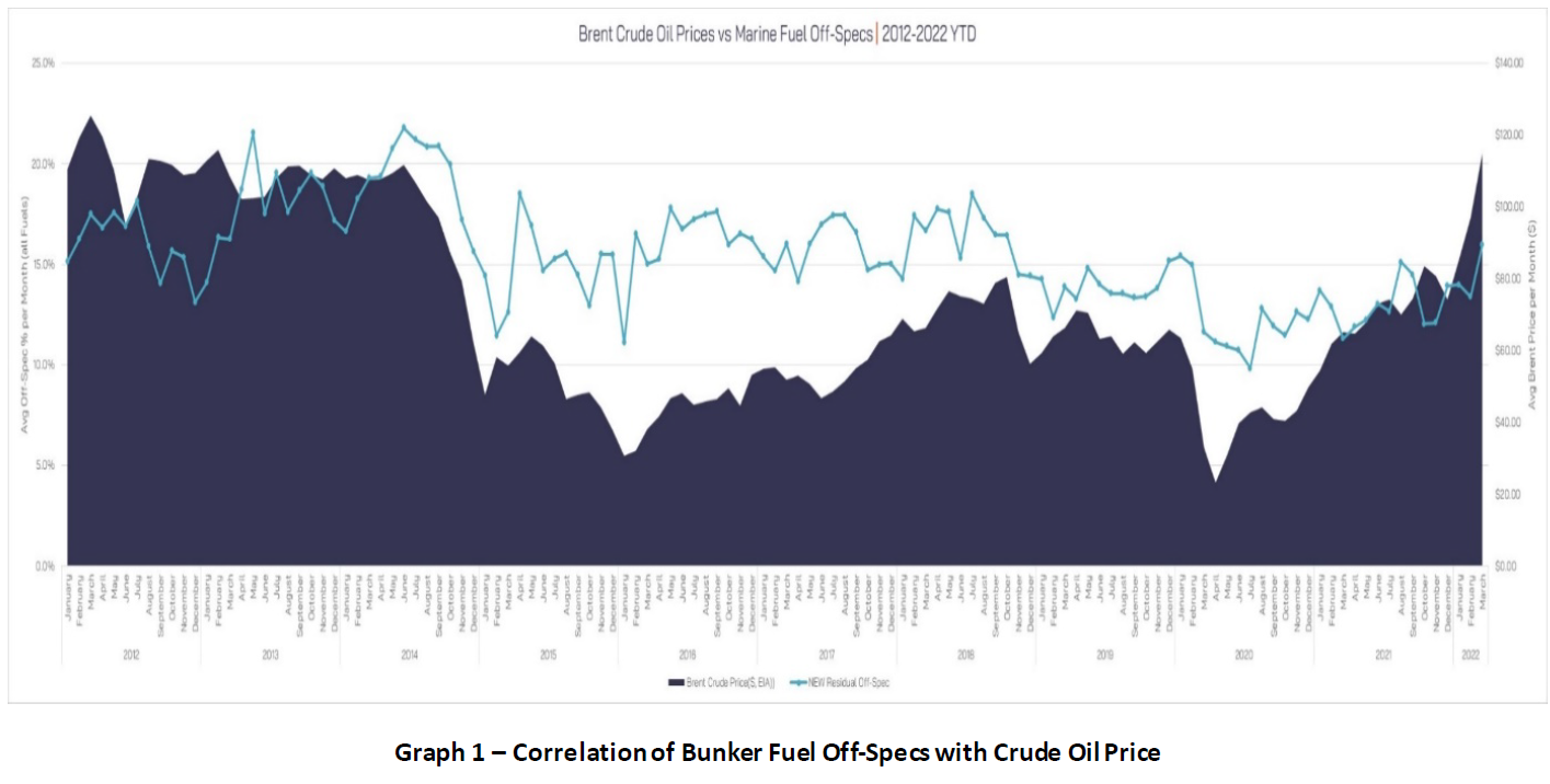 However, in a recent in-depth study carried out by VPS during Q1-2022, a strong correlation between crude oil price and bunker fuel off-specs was identified. Based on data covering the past 10 years and using a huge dataset of our 1.2 million fuel samples tested during this period, a correlation can be shown, which is graphically illustrated in Graph 1: