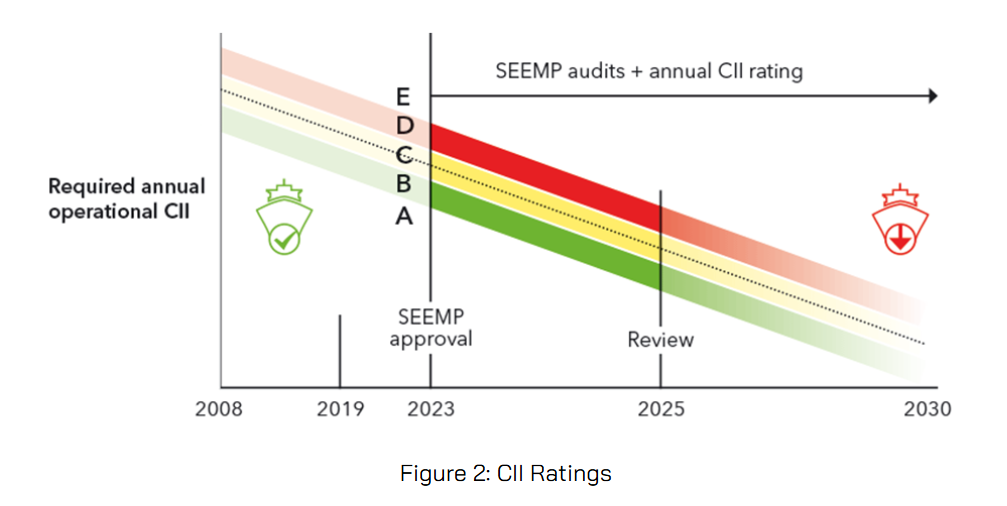 CII - Carbon Intensity Index, which determines the annual reduction factor needed to ensure continuous improvement of a ship's operational carbon intensity within a specific rating level. The ratings go from an inferior performance level – E, to the major superior level – A. Measuring the CO₂ emitted per cargo-carrying capacity per nautical mile, CII incorporates, speed optimization, biofouling management and alternative fuels usage.