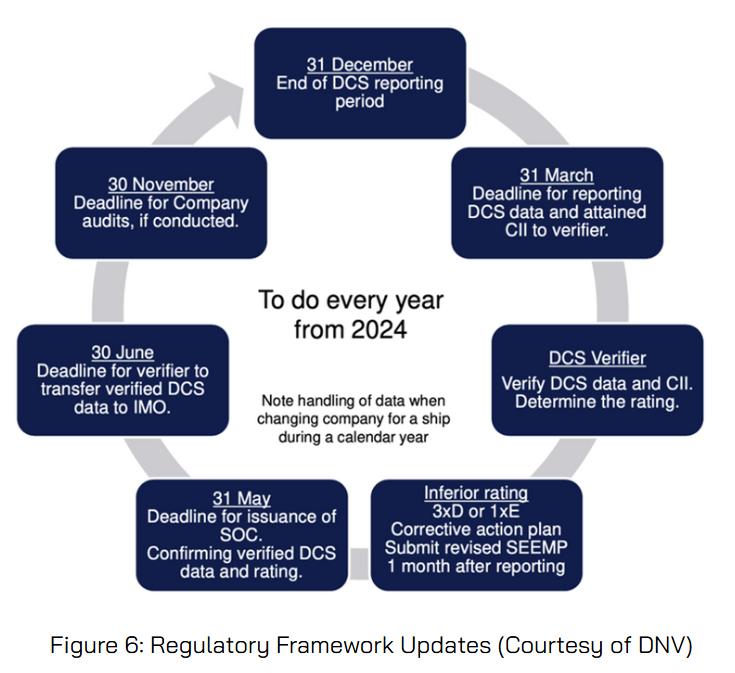 Since 2024, the CII must be calculated and reported to the Data Collection System Verifier along with the previous year’s aggregated DCS data. This must include any correction factors or voyage adjustments. The deadline for DCS and CII submission is no later than 31 March each year.