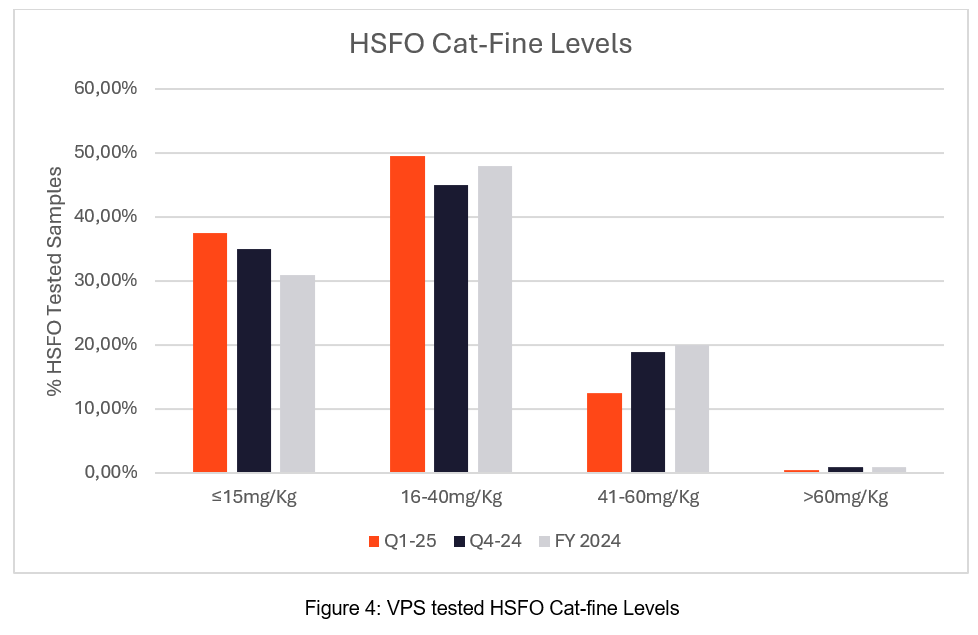 For HSFOs across Q1-2025, 12.5% of all samples tested had cat-fine levels between 41-60 mg/Kg, which was lower level than Q4-2024 and full year 2024, at 19% and 20% respectively. These levels are also high enough to cause concern and would trigger the request for additional FSC samples to be sent for analysis.
