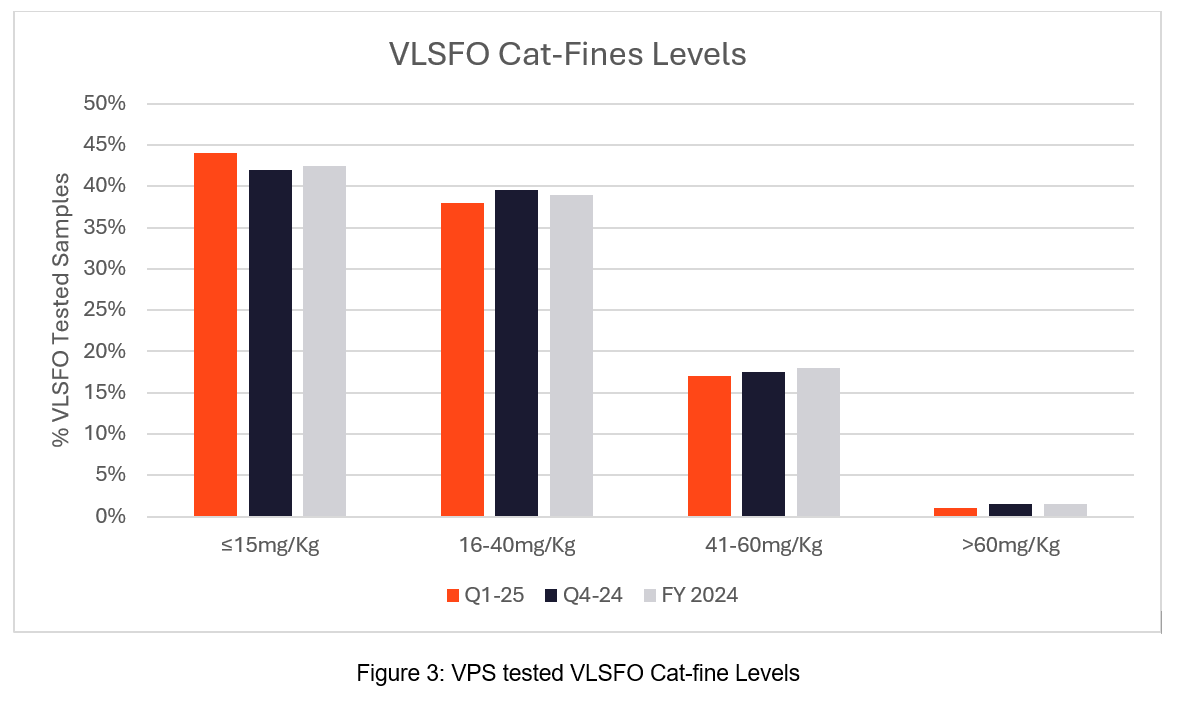 For VLSFOs across Q1-2025, 17% of all samples tested had cat-fine levels between 41-60 mg/Kg, which was slightly lower level than Q4-2024 and full year 2024, at 18%. These levels are high enough to cause concern and would trigger the request for additional FSC samples to be sent for analysis.