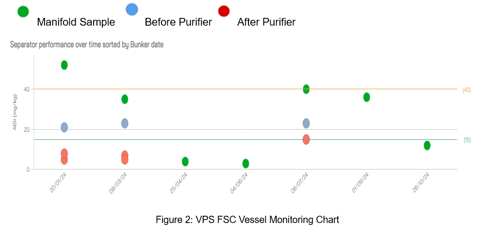 As part of the VPS FSC service, each vessel has a monitoring chart checking the cat-fine level upon receipt of the fuel, then the before-purifier level and the after-purifier level. Should any submitted FQT (Manifold) sample show >40mg/Kg Cat-fines, then the vessel will be advised to send an additional sample for Fuel System Check. The before-purifier sample should always have a lower cat-fine level than the manifold sample. Then the after-purifier should always be below 15mg/kg cat-fines, if the purifier is working efficiently.