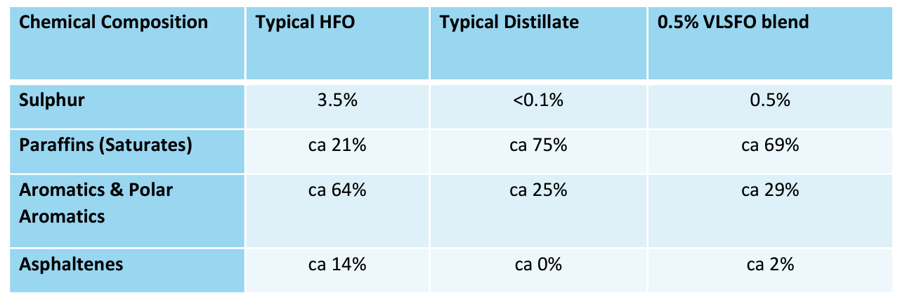 Whilst its possible certain VLSFOs may have elevated aromatic content, it is to be expected that for VLSFO fuels produced by blending, such fuels will have lower aromatic content than a typical Heavy Fuel Oil (HFO) since the major blended component (distillate) has typically half the aromatic content: