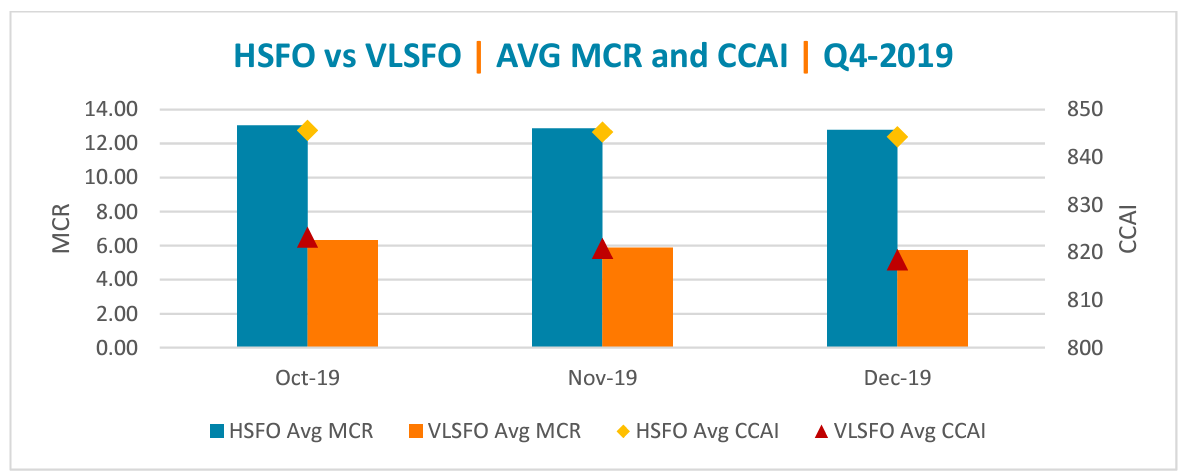 The figure below provides a comparison of the average MCR and CCAI values for all VPS tested HSFO and VLSFO samples in Q4‐2019. It illustrates that both MCR and CCAI are much lower for VLSFOs than for HSFOs, which means that these VLSFOs tested, could have lower potential for black carbon emissions than HSFOs.