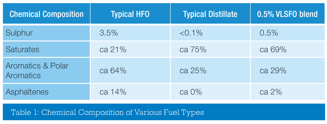 Even within this group of new fuels, all being broadly termed very low sulphur fuel oils (VLSFOs), there are many where their only common characteristic is the fact they have a sulphur content of 0.50% or lower. Many of these fuels are blended products (ULS distillates + LS residues), utilising hydro-treated vacuum gas oils and hydrocracker fractionator bottoms as part of their make-up. In addition, various other cutter stocks, diluents and additives may also be present within these fuels. This level of variation in components leads to a wide range of chemistries and considerations regarding the management of such fuels.