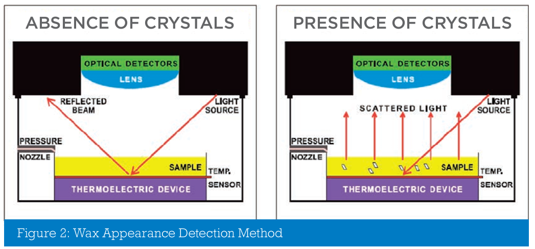 Furthermore, PP is affected by the presence of additives within a fuel, whilst CP being a fundamental fuel property is not. Due to the high paraffinic content of VLSFOs, wax may precipitate at temperatures far higher than the current PP +10°C guidance. A much more reliable method of monitoring the likelihood of fuel waxing is to measure the CP. In order to overcome the issue of not being able to measure the CP of opaque fuels and to provide valuable information with respect to the cold-flow of VLSFOs, VPS has developed an in-house method for the measurement of the Wax Appearance Temperature (WAT) of VLSFOs (WAT is the same as CP). In addition, VPS developed this equipment to measure the Wax Disappearance Temperature (WDT), which is the temperature at which the last wax solids are melted into liquid when the oil is warmed. As such it provides an indication of the temperature that the fuel must be heated to in order to fully dissolve any wax solids that have precipitated. This method is based upon ASTM D5773, utilising a light-scattering optical measurement within the near-infrared spectrum as shown in Figure 2.