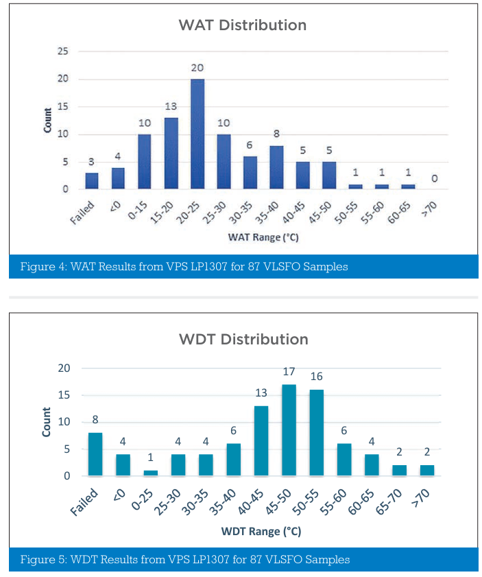 Over the past months, 87 currently available commercial VLSFO samples from fuel bunkered in Singapore, Rotterdam, Fujairah and Houston were tested using the new VPS method. These VLSFOs showed a very wide range of Wax Appearance Temperatures (0°C-65°C), with many at elevated temperatures, demonstrating VLSFOs must be maintained at much higher temperatures than traditional HFOs, and the operational importance of measuring WAT. The WDT for those same 87 VLSFOs, showed how much higher temperatures need to be to ensure the wax has fully melted, once it has been allowed to appear, (0°C - 70°C +). The temperature difference between WDT and WAT can be up to 20°C or more, in certain cases. Using this new VPS test method, key fuel management and operational information can be obtained for the new VLSFOs in relation to safe storage, transfer and overall handling of these new fuels with respect to their specific Wax Appearance Temperature. Fuels maintained above their wax appearance temperature will always flow, thus preventing cold-flow problems. However, should the fuel be allowed to fall below their WAT, then their specific WDT will indicate the temperature required to ensure the wax has fully dissolved.