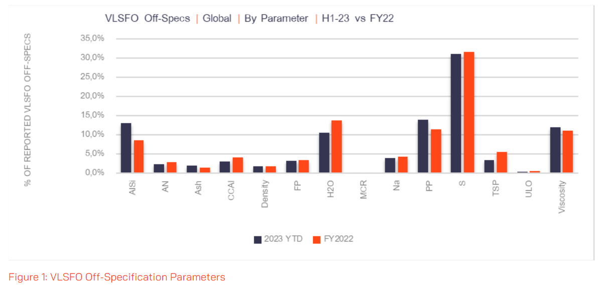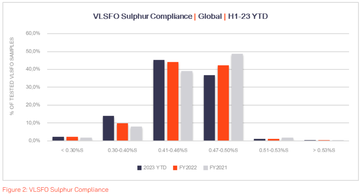 Sulphur off-specification is the most common of all VLSFO off-specifications, with over 30% of all off-specifications being attributed to this one parameter. However, recent test results have shown that sulphur off-specification is certainly better today than it was back in 2021, with only 1.6% of VLSFOs tested being >0.50% Sulphur compared to 2.4% >0.50% in 2021.