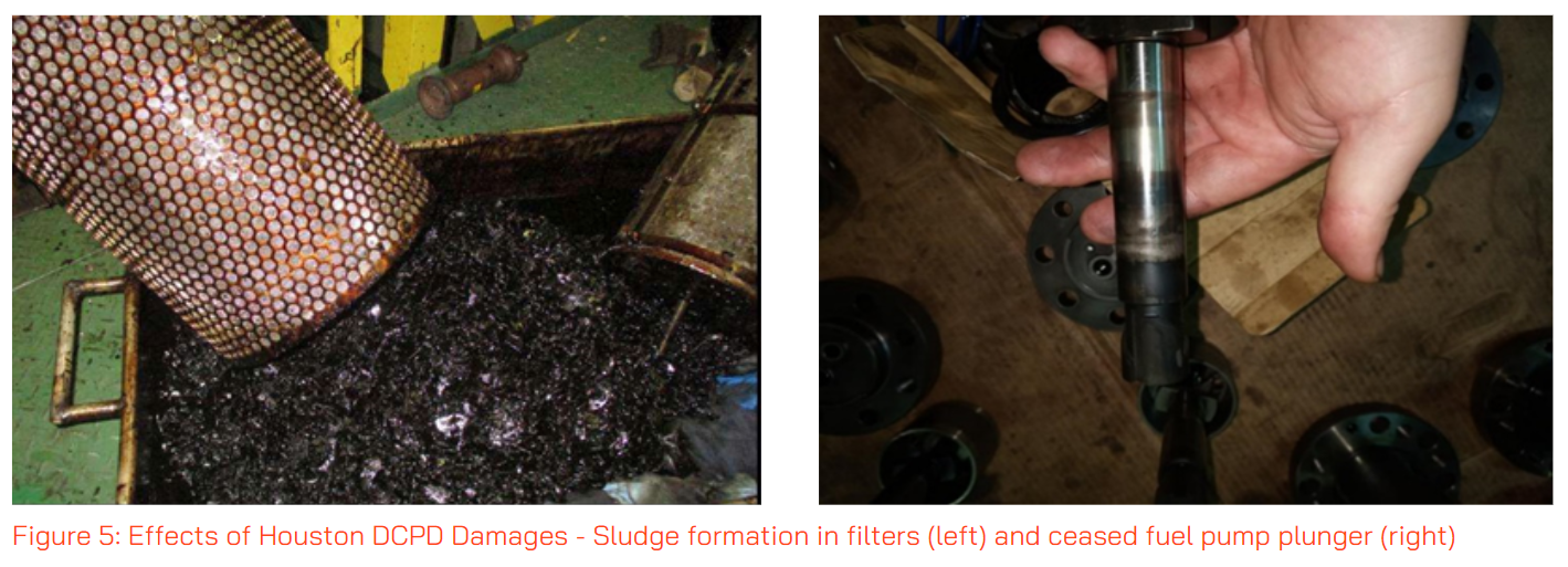 DCPD’s are unsaturated chemical compounds which can polymerise and oxidise under certain conditions. When DCPD polymerises, the fuel begins to exhibit a level of stickiness and becomes more viscous, making it difficult for moving components, eg fuel pump plungers & fuel injector spindles to move freely. These effects cause damage to the fuel injection system. Over a period of time excessive sludge formation is likely to be experienced.