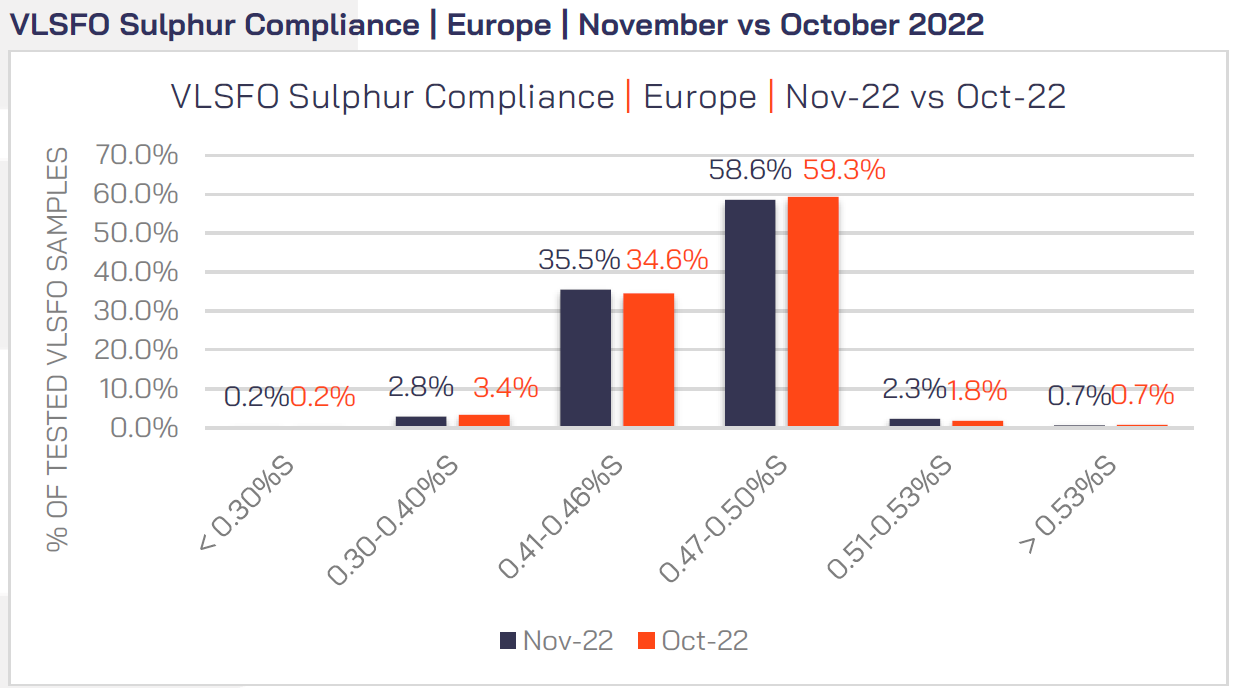 Global VLSFO sulphur non-compliance during the final quarter of 2022, remained relatively constant at 1.2% for all VPS-tested VLSFO stems. Focusing on Europe, we can see in the graphic below that 3% of all VLSFOs bunkered in the region showed a sulphur level of >0.50%, with 0.7% being >0.53%: